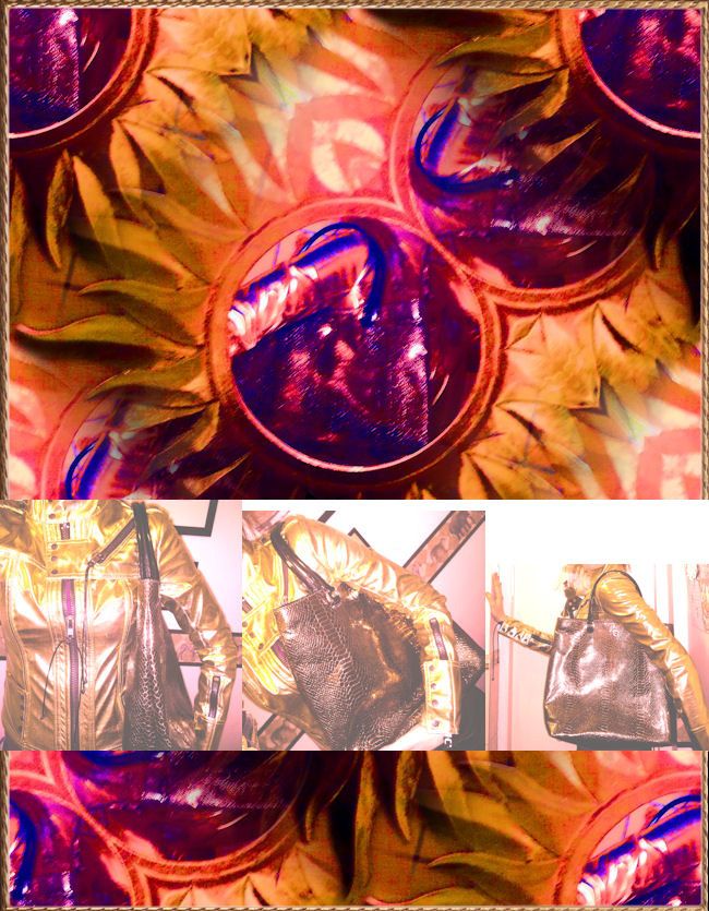 täältä). Mieleeni tuli monia yhdistelmiä, mm. alla olevassa kuvakollaasissa olen yhdistänyt laukun Lip Servicen kultaiseen vinyylitakkiin. Takki on High Voltage Vinyl -mallistoa vuodelta 2004.