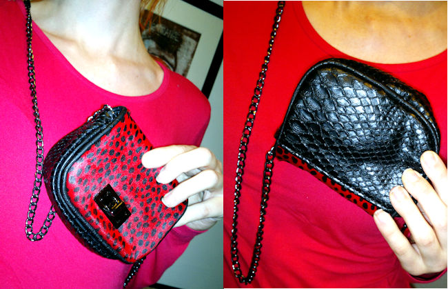 Punainen leopardikuosi taas varmasti jakaa monen mielipiteet, mutta täytyy tunnustaa että kyseessä on lempileopardikuosini - pidän siitä nimenomaan punaisena versiona. Aleksi 13 -liikkeessä oli allaoleva pikkulaukku merkkiä My Bag alennuksessa.