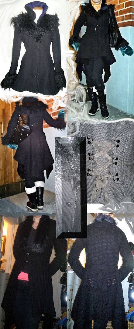 Nyt kun vihdoin ja viimein ilmassa on kevään tuoksu, uskaltauduin pukeutua hieman kevyempään talvitakkiin. Pahoittelen kuvien rakeisuutta, mutta tästä saa ideaa kuitenkin takin muodosta. Kyseessä on Lip Service -merkin Wicked Winter Coat. Todella pientä mitoitusta, eli jos joku harkitsee tuota esim eBaysta tilaavansa, niin kannattaa ottaa kokoa suurempi kuin normaalisti tilaisit. Omani on kokoa L! Alle tietenkin puin Poizen Industries -Cara neuletakin. 100% akryylia, mutta olkoot. Lämmittää nyt lopputalvesta. Ja ah, tuplakarvakaulus. Liehuhelma. Furrr... Turkoosit tekokarvahansikkaat, Seppälän ale.